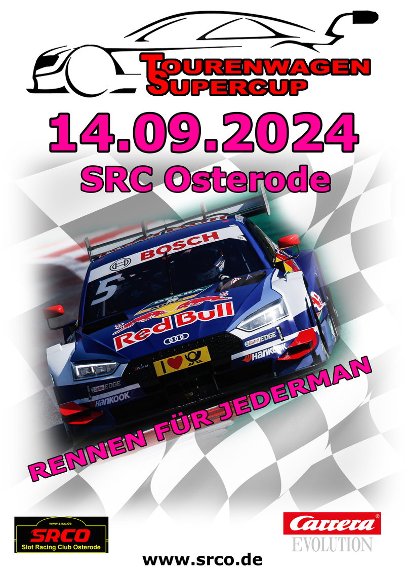 Der Tourenwagen Supercup wir auf verschiedenen Strecken ausgetagen, er wird mit Carrera 132 Analog (Evolution) Fahrzeugen gefahren. Die Fahrzeuge dürfen einen Wackel haben, die Reifen und de Leitkiel darf getauscht werden. Weiter muss der hintere Magnet ausgebaut werden, alles weitere findet ihr im Reglement.